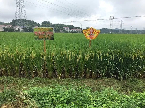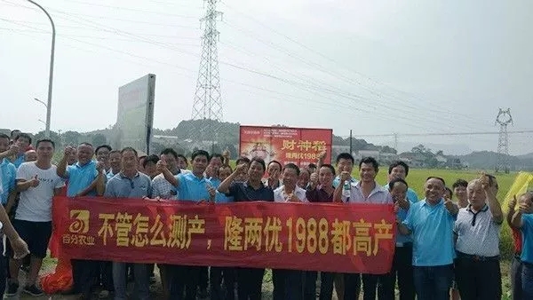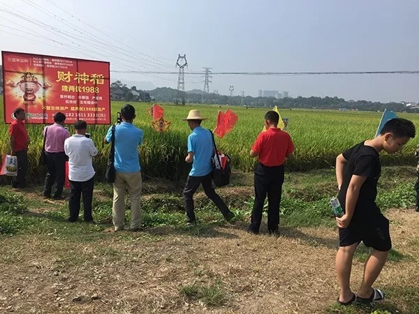 上午9時許,一行50多人從酒店出發(fā)前往北盛鎮(zhèn)隆兩優(yōu)1988觀摩會現(xiàn)場,田間立著財神稻的展示噴繪,財神客戶們紛紛駐足拍照留影,有的還下到田里看穗子、數(shù)分蘗,仔細查看品種表現(xiàn)。觀摩田塊為5月18日播種,瀏陽區(qū)域大部分農(nóng)戶都是選擇一晚種植,集中在5月中下旬播種,剛好遭遇了高溫高濕的天氣,隆兩優(yōu)1988在今年特殊年份所表現(xiàn)出的超高結(jié)實率、稻瘟病抗性、分蘗能力得到在場所有人的一致好評。