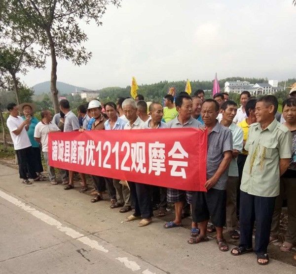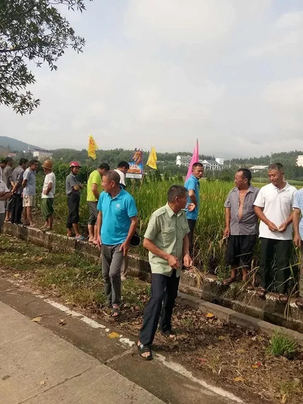 上午九點開始,農(nóng)戶陸陸續(xù)續(xù)集合,集合完畢之后,大家一起趕往隆王稻觀摩田塊。不用說,開始看田塊了,三三兩兩的,開始散開了,看株型、看穗子、數(shù)結(jié)實率,很多農(nóng)戶直接翻開稻子,檢查稻桿和根,看有無稻飛虱,鉆心蟲。今年飛虱、鉆心蟲肆掠了當?shù)氐奶飰K,這兩種病蟲害比較多,大家也更加關(guān)注品種的抗病性了。看完后,大家表示很滿意,這塊田不僅分蘗結(jié)實很強,連當?shù)厥⑿械娘w虱、鉆心蟲都無影無蹤,讓大家更加欣喜的是,隆王稻的米質(zhì)那可是數(shù)一數(shù)二的,這個品種的表現(xiàn)實在是完美,不用說,來年就種它了。
