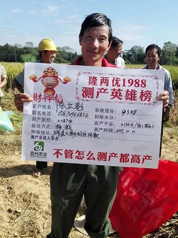 石鎮(zhèn)鎮(zhèn)桐源村種植大戶陳立魁種了38畝財(cái)神稻,用種45斤,移栽、測(cè)產(chǎn)所選田塊非最好田塊,表現(xiàn)為中上水平,非常具有代表性。測(cè)產(chǎn)采取原始手工收割,腳踏打谷機(jī)方式,割了0.087畝,谷子93.7公斤,抹除尾數(shù),折合畝產(chǎn)濕谷2136斤。這個(gè)結(jié)果非常具有震撼力和吸引力,與會(huì)人員極其看好財(cái)神稻。