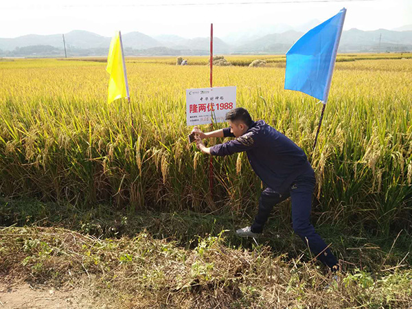 2017年11月3日早晨7點廣西賀州市鋪門鎮(zhèn)南華村忽然熱鬧起來,原來是鋪門鎮(zhèn)隆兩優(yōu)1988經(jīng)銷商陳美香邀請了鋪門鎮(zhèn)種植大戶和水稻種植合作社的老板們前來田間觀摩財神稻,首先,代理商梁總介紹,這塊田的戶主是一對年過7旬的老人家,因老人家精力不足所以在田間管理與施肥方面相對缺乏,只靠田塊原本的肥水條件自然生長,但隆兩優(yōu)1988的長勢和表現(xiàn)卻遠(yuǎn)遠(yuǎn)超越周邊的其它品種,這使農(nóng)戶們驚嘆不已!