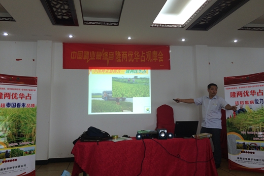 安徽分公司總經(jīng)理武俊海給零售商做品種介紹,通過(guò)例舉在不同的氣候條件、不同的栽培模式下品種的表現(xiàn)情況,總結(jié)了隆兩優(yōu)華占的八大亮點(diǎn):1、株葉形態(tài)好;2、分蘗力強(qiáng);3、耐肥、抗倒;4、高抗稻瘟?。?、耐高溫抗低溫;6、適合各種栽培模式;7、秧齡彈性大;8、主穗、分蘗穗整齊大小一致。