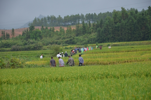 2014年9月19日,早晨8點(diǎn)40分,天下起了小雨。七琴鎮(zhèn)的種子零售商洪海平略帶擔(dān)心地看了看手機(jī)上的時(shí)間,離約好去田間觀摩中國(guó)龍稻—隆兩優(yōu)華占只剩半個(gè)小時(shí)了,卻只到了不到10人。雨卻是越下越大。突然,一陣陣摩托車的轟鳴聲由遠(yuǎn)及近,洪老板的臉上也露出了笑容,正是農(nóng)民朋友們冒著雨一個(gè)接一個(gè)地抵達(dá)集合點(diǎn),隨后拿著領(lǐng)取到的宣傳資料笑著交談著,等待著出發(fā)。