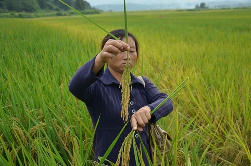 觀摩最后,大家一起觀摩了第三處的一季中稻,據(jù)種植者楊大姐介紹,這十畝田種下去之后基本上沒(méi)有管理過(guò),現(xiàn)在來(lái)看,一直沒(méi)有發(fā)生過(guò)病蟲(chóng)害,也不倒伏,抗性非常好。同時(shí),我們?cè)谔镩g驚訝的發(fā)現(xiàn),即便在缺少肥料的情況下,隆兩優(yōu)華占整體依然挺拔,只是穗子略有變小,粒數(shù)減少,但是其結(jié)實(shí)率保持在95%以上!楊大姐表示:明年一定全種隆兩優(yōu)華占,一定管理好,一定種出更高產(chǎn)!