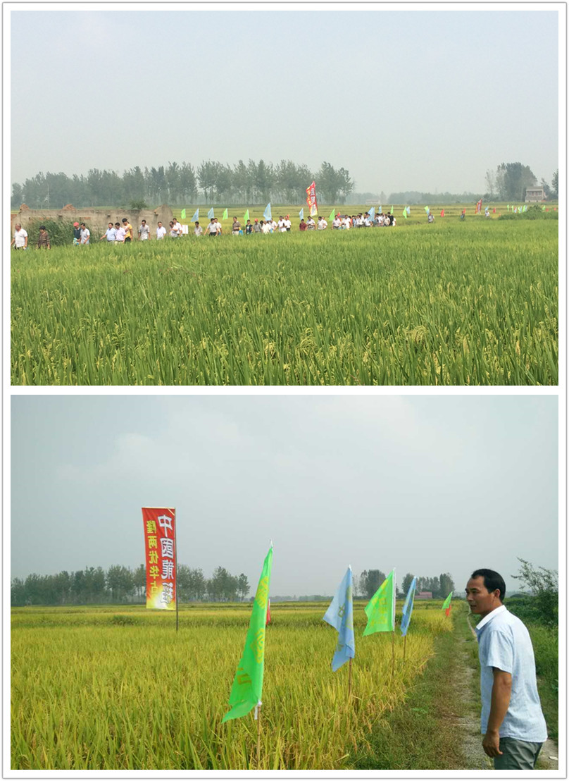2015年8月29日,在霍邱縣宋店鄉(xiāng)的一片稻田中,166位零售商和種田大戶參加中國最強(qiáng)音—隆兩優(yōu)華占現(xiàn)場觀摩會,印有“中國龍稻 隆兩優(yōu)華占”字樣的超大旗幟在微風(fēng)中飄揚(yáng)。一大群人圍繞著稻田,有的數(shù)分蘗,有的數(shù)稻粒,有的查看是否有空殼或病蟲害,他們查看后紛紛豎起大拇指,稱贊隆兩優(yōu)華占真心不錯!