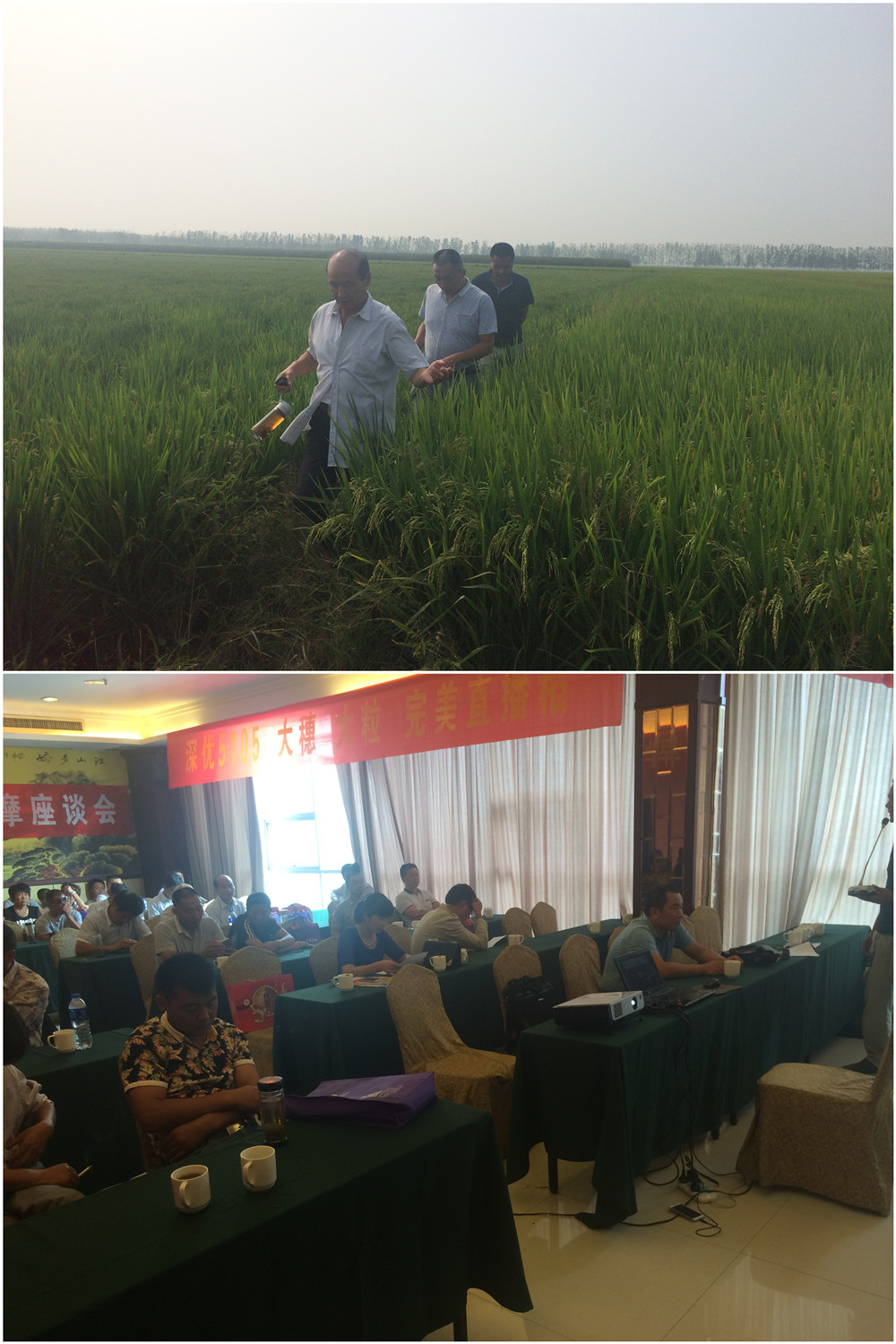 室內(nèi)會(huì)議代理商向大家介紹了他種植深優(yōu)5105的一些情況:“今年在苗期遇上大水,示范田被淹了半個(gè)月,肥料都被水帶走了。后期因?yàn)槊τ谏鉀]有顧得上管理,一直處于干旱狀態(tài),品種的大穗性狀沒有凸顯出來。因?yàn)槿ツ晖茝V面積小,長(zhǎng)得好的幾個(gè)田塊路途比較遠(yuǎn),才選了這里作為現(xiàn)場(chǎng)”。通過示范,他認(rèn)為深優(yōu)5105是一個(gè)大穗大粒、分蘗力強(qiáng)、耐肥抗倒的優(yōu)良直播稻品種。如果采用旱播水管的種植模式更能突顯品種的優(yōu)良特性,他相信深優(yōu)5105將成為當(dāng)?shù)刂辈サ局械耐跖破贩N!
