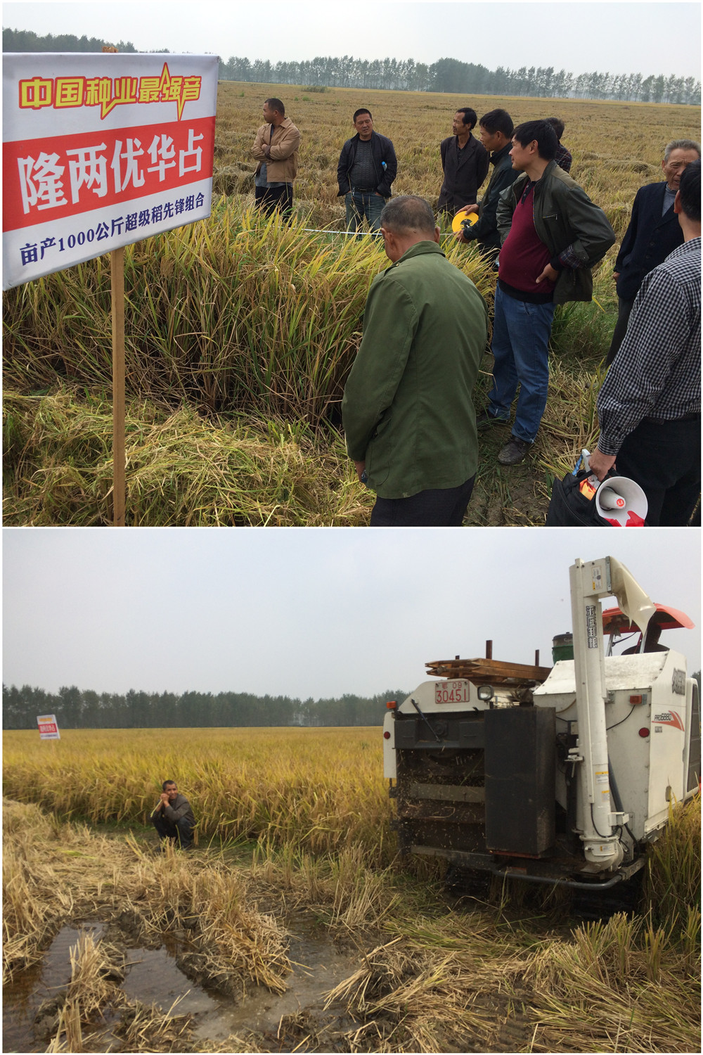 漢川代理商許合斌說:“隆兩優(yōu)華占的產(chǎn)量,要是只有2.2斤/平方,我絕對(duì)不會(huì)叫大家來看!收割機(jī)來了,我們收了看!”