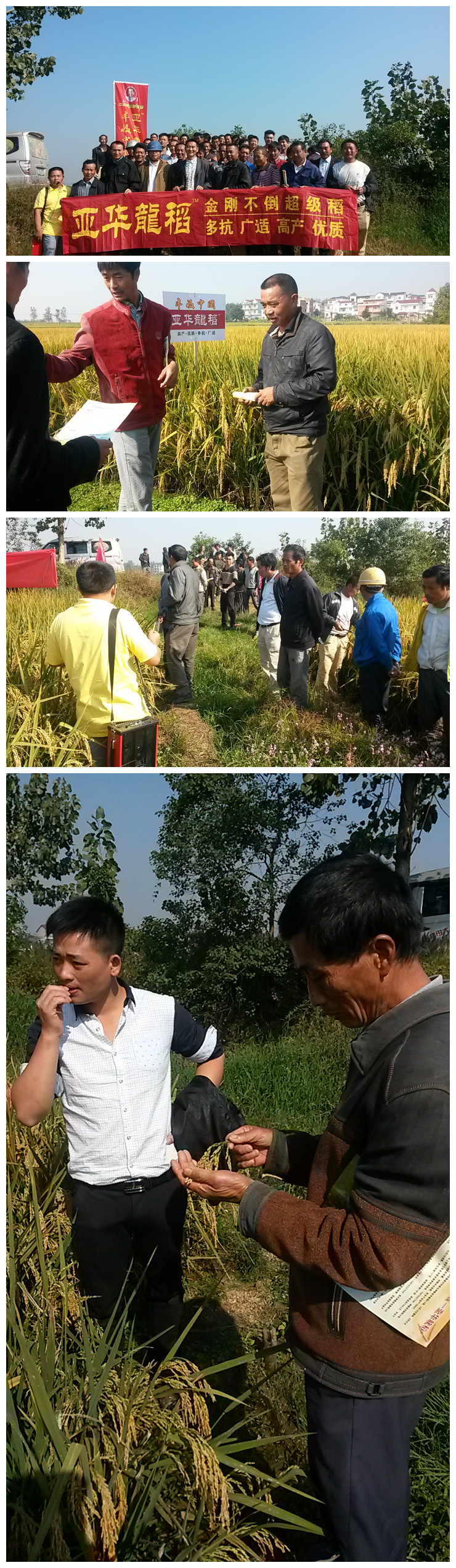 2015年10月15號(hào),在江西萬年縣湖云鄉(xiāng)白馬村,迎面而來的是彩旗飄飄、稻浪滾滾的示范田,就在這番美景之中順利召開了亞華龍稻現(xiàn)場(chǎng)觀摩會(huì)。人們不由自主地下到田邊、田中去近距離地觀看和親近這美景。人們仔細(xì)地觀看后說:“這品種結(jié)實(shí)率真高!到穗頸處的谷粒都是個(gè)個(gè)飽滿”“亞華龍稻的發(fā)蔸能力真強(qiáng),平均有15根,按照這田間表現(xiàn)收割定是大豐收”!