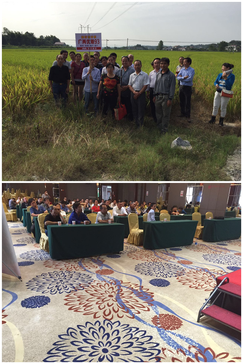 2015年9月28日,寧鄉(xiāng)寧農農資公司組織20位核心零售商來到大成橋鎮(zhèn),現(xiàn)場觀摩農戶連片種植的50畝廣兩優(yōu)矮93大田表現(xiàn)。當大家看見路邊連片金黃色的稻田,興趣立刻高漲起來,急忙走下大田中查看廣兩優(yōu)矮93的表現(xiàn),廣兩優(yōu)矮93表現(xiàn)出結實率很高、無病害,特別是在今年雨水較多但依然無稻曲病危害。