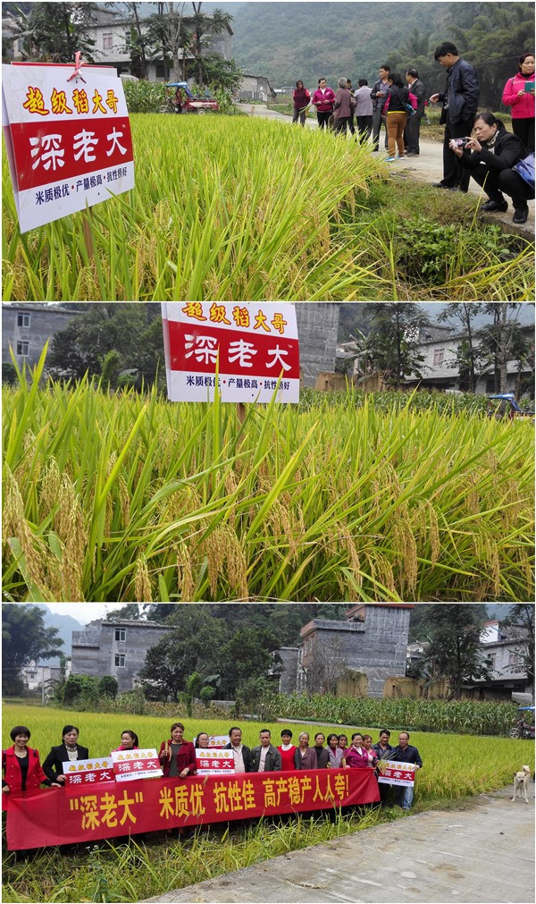 “這哪像晚造田啊,我看倒像中稻田!”“上面一層的穗子,都看不到劍葉啦!”……同來的東蘭縣種子管理站現(xiàn)任站長陳建相撥開邊上的稻株,深入到田塊中間細(xì)細(xì)察看,看有沒有病蟲危害,同時(shí)慢慢地摸捏著稻穗估算結(jié)實(shí)率。一早驅(qū)車500多里從宜州市遠(yuǎn)道趕來的新合作的經(jīng)銷商韋娟,不顧勞頓,圍著“深老大”的田塊包了個(gè)圈,又到相鄰其他幾個(gè)品種的田塊邊走了走,回來興沖沖地說道:“還是‘深老大’好看,劍葉增一分太長,減一分又太短;桿子也是不高不矮正合適;穗子就更不要說了,勻稱得好!結(jié)實(shí)率又高,幾乎沒有癟谷! ‘深老大’就像位大家閨秀!”一席生動(dòng)的話語把大家都逗得笑哈哈。
