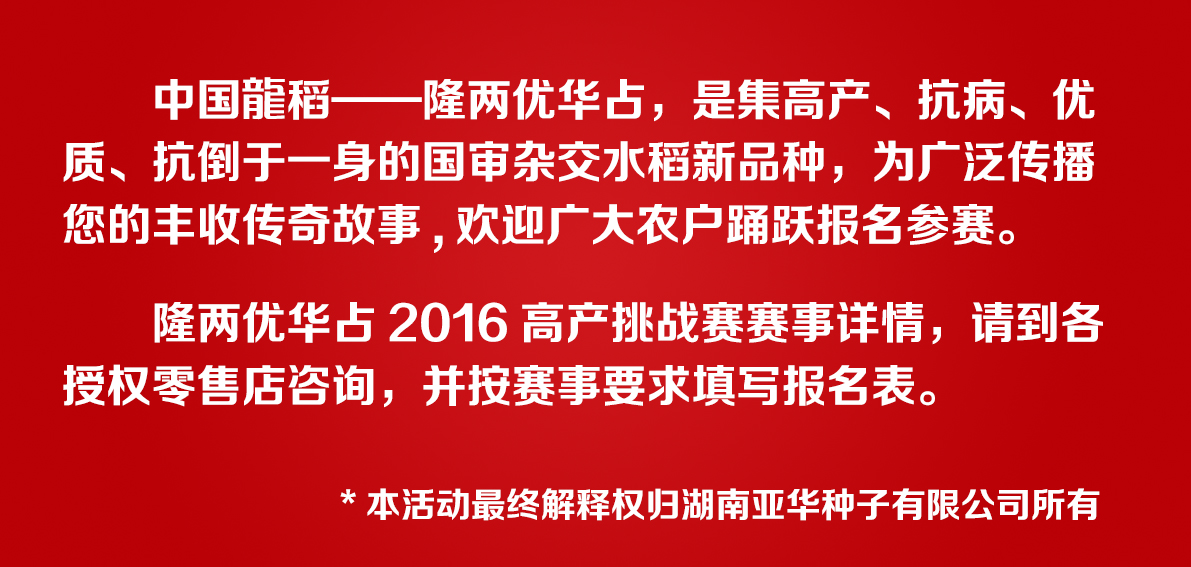 隆兩優(yōu)華占2016高產(chǎn)挑戰(zhàn)賽報(bào)名開始啦!
