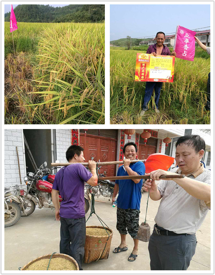 2016年8月25日,在南城縣龍湖鄉(xiāng),亞華香占做的一季早稻迎來了豐收。種植戶收割了2.4畝,割出63袋谷子,他自己也沒有想到產(chǎn)量能有這么好,高興地將這個喜訊告知代理商與親朋好友,第二天在慕名前來的40余人共同見證下現(xiàn)場收割測產(chǎn),實割0.38畝,收谷828斤,扣除20%水分,合畝產(chǎn)干谷1743斤,刷新了去年一季早稻的高產(chǎn)記錄。