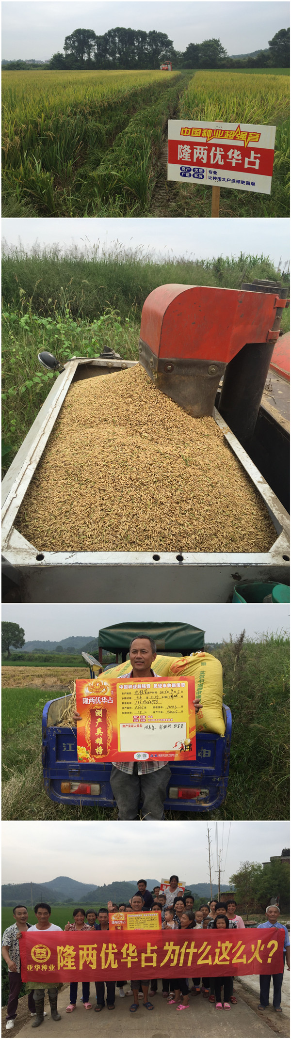 去年上坊村種田大戶彭秋賢得知隆兩優(yōu)華占的優(yōu)異表現(xiàn)后,今年連片種植50畝,其中20畝為一季遲早稻(4.20日播種),其余為一季中稻。2016年9月6日,經(jīng)實地收割隆兩優(yōu)華占一季遲早稻0.637畝,產(chǎn)1004.3斤濕谷,折合產(chǎn)干谷1340.5斤/畝,比相鄰田塊其他品種高100斤以上,彭秋賢喜色溢于言表,并表示一季中稻更好,希望收割時再來一場測產(chǎn)。