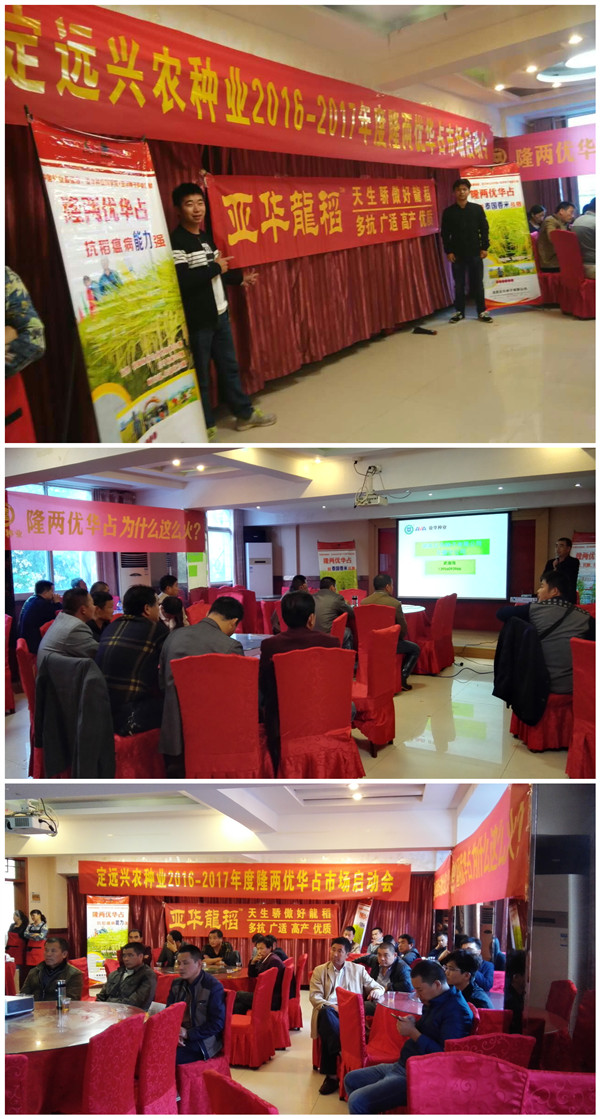 2016年9月30日,在安徽省定遠(yuǎn)縣,興農(nóng)種業(yè)組織隆重召開了定遠(yuǎn)縣2016~2017年度隆兩優(yōu)華占市場啟動會。當(dāng)日秋雨連綿不斷,寒風(fēng)吹動旗角,聲聲作響,將“隆兩優(yōu)華占”一列列金字抖得威風(fēng)凜凜,霸氣十足。