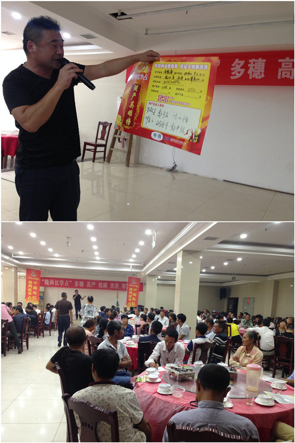 測產(chǎn)過后,大家歡聚在問安鎮(zhèn)博杰酒店。亞華種子公司的黃經(jīng)理向大家介紹了隆兩優(yōu)華占各地歷年的表現(xiàn),并強(qiáng)調(diào)了隆兩優(yōu)華占的廣適性,最后跟大家互動起來:隆兩優(yōu)華占為什么這么火?現(xiàn)場與會人員積極搶答,大家總結(jié)出數(shù)十條理由。隨后,代理商張總介紹了隆兩優(yōu)華占在接受洪水、臺風(fēng)、高溫洗禮后的優(yōu)異表現(xiàn)。同時,總結(jié)了隆兩優(yōu)華占低肥穩(wěn)產(chǎn)、中肥高產(chǎn)、高肥豐產(chǎn)的特點(diǎn),并表示隆兩優(yōu)華占是綜合性狀最好的廣適性品種。大家紛紛表示贊同,慶幸自己今年擴(kuò)大了隆兩優(yōu)華占的種植面積而豐收。在當(dāng)?shù)?,隆兩?yōu)華占比大多數(shù)品種畝產(chǎn)高出200斤這一事實(shí)已家喻戶曉。