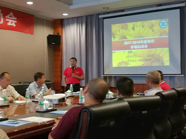 會(huì)議開始由姜總發(fā)表講話,姜總分別就亞華種業(yè)的品種優(yōu)勢(shì)、資金實(shí)力、科研營銷團(tuán)隊(duì)以及種子加工、質(zhì)量嚴(yán)格把控等各方面給與會(huì)人員做了介紹,并和大家分享了“選擇大于努力”的財(cái)富成功故事,為2018隆兩優(yōu)華占繼續(xù)強(qiáng)勢(shì)挺進(jìn)鼓氣。最后姜總詳細(xì)講解了公司在鐘祥市場的宣傳計(jì)劃,各種獎(jiǎng)懲措施以及資金人力投入等,為2018隆兩優(yōu)華占再戰(zhàn)輝煌作好準(zhǔn)備。