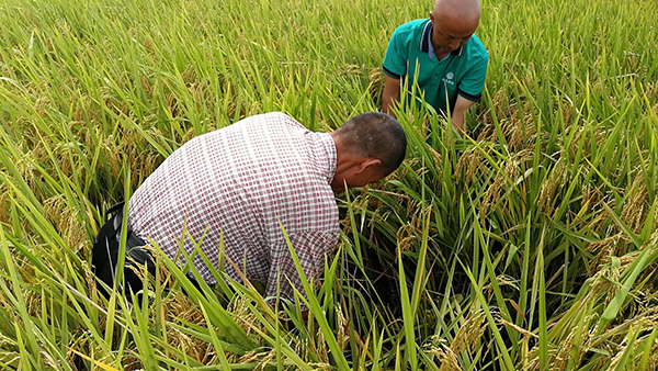 下雨也阻擋不住客戶的熱情,有不少的種植戶開始討論這塊田的產(chǎn)量“應(yīng)該在1600左右吧”、“這應(yīng)該不少于1700斤”,原計(jì)劃用收割機(jī)進(jìn)行收割,后改為現(xiàn)場隨機(jī)測產(chǎn),現(xiàn)場采用人工打谷的方式,扣除20%水份,折合標(biāo)準(zhǔn)畝干谷產(chǎn)量1810斤。