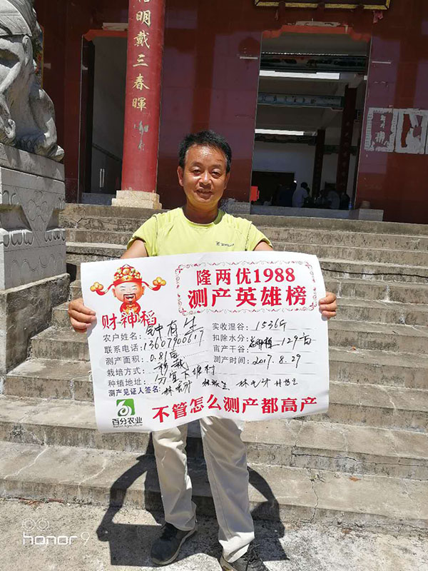 2017年8月29日,江西分宜縣下塘村一百多位種植大戶齊聚田間,只為一睹財(cái)神稻隆兩優(yōu)1988的高產(chǎn)傳奇。