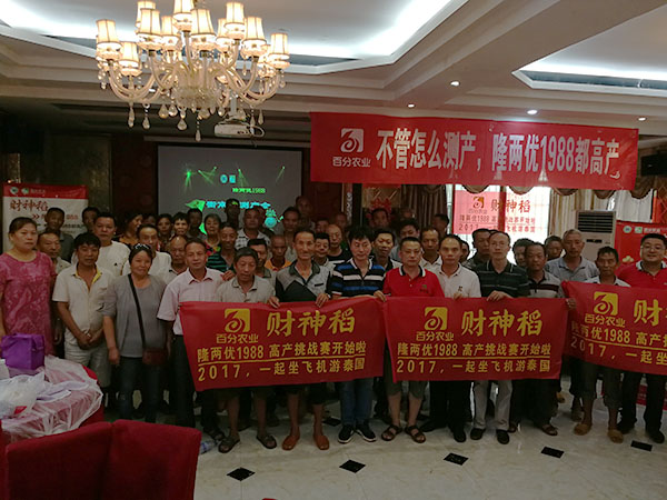 測產(chǎn)會(huì)后,在洪山鎮(zhèn)零售商胡老板的主持下召開室內(nèi)會(huì)議,會(huì)議首先由百分農(nóng)業(yè)湖南財(cái)神線經(jīng)理陳鋒就百分農(nóng)業(yè)概況、財(cái)神稻在全國各區(qū)域的表現(xiàn)、高產(chǎn)賽等情況給在場的觀摩人員進(jìn)行了介紹與講解。之后與會(huì)的零售商和種植大戶就財(cái)神稻的種植要點(diǎn)以及田間管理要求進(jìn)行了交流。會(huì)場十分火爆,有種植大戶之前對(duì)品種選擇十分猶豫,70多畝田選了好幾個(gè)品種種植進(jìn)行對(duì)比,財(cái)神稻高抗病、耐高溫、高抗倒的表現(xiàn)在田間表現(xiàn)得淋漓盡致,所以種植大戶說明年只種財(cái)神稻。