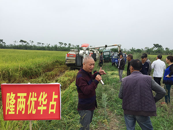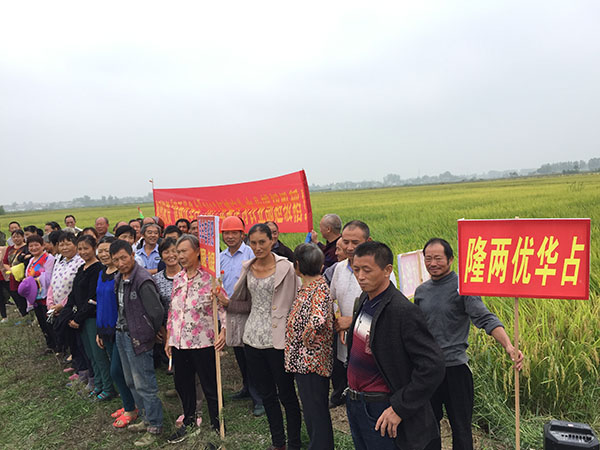 2017年9月5日,來自紙廠河鎮(zhèn)的60余名農(nóng)戶在當?shù)芈蓛?yōu)華占零售商肖建平經(jīng)理的組織下,來到位于大湖村5組黃文平的田間,參加隆兩優(yōu)華占的現(xiàn)場實收會。