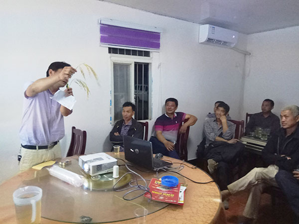 中午,由百分農業(yè)袁經理和零售商老板組織室內會議。首先,由公司袁經理給大家重點講解隆兩優(yōu)1988品種今年在當陽各鄉(xiāng)鎮(zhèn)的抗倒、抗病、產量等優(yōu)勢特征,然后由財神稻代理商朱錦華介紹種植財神稻的關鍵技術,宣布今天預訂政策,不到半個小時,就完成訂購460斤,其中還有多位種植戶直接預訂40斤,現場非常火爆。