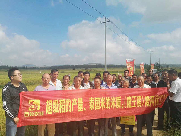 在觀摩會議開始前,百分農業(yè)程經理從隆兩優(yōu)1212的審定情況、抗病性、抗倒性、高產等基本品種特性向農戶們進行了詳細地講解。還未進行田間觀摩時訂購量已經達到了200斤,隨后便在代理商郭總和當地零售商的帶領下一起乘車前往示范點現場觀摩。