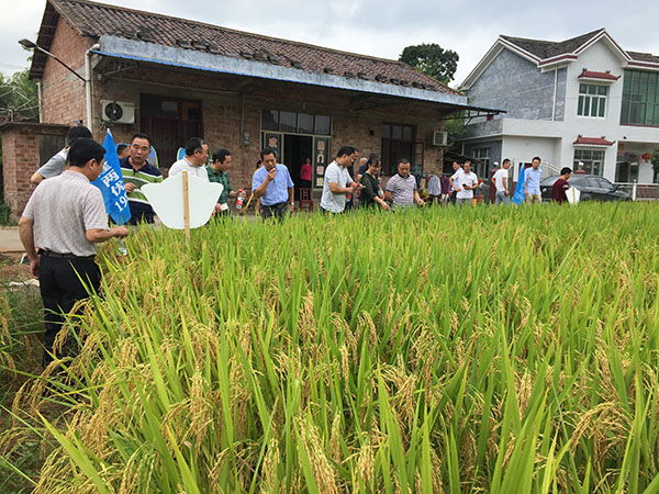 上午9點半左右,與會所有人員集合完畢,一行20余人驅車前往位于醴陵茶山鎮(zhèn)的隆兩優(yōu)1988種植田塊觀摩,定要讓大家眼見為實!10點多到達觀摩點,雖然烈日當頭,但還是擋不住零售商們的觀摩熱情,據該田塊的種植農戶反應,5月中下旬撒播,肥力水平一般,基本屬于粗放狀態(tài)。吳總說,這個觀摩田也是臨時找的,前面定的田塊農戶沒通知就收割了。來到示范田給零售商們的第一感覺就是:滿田都是谷子啊!再看看邊上幾塊田,要么葉瘟嚴重,要么有效穗不足、結實率低、空癟粒多,和財神稻根本不能比??剐詮姟⒏弋a穩(wěn)產、耐高溫、結實率高是財神稻的主要特點。零售商們紛紛拍照記錄,還有一個客戶甚至跑到田中間數有效穗,還隨便抽了幾穗谷子,自己在一旁蹲下來默默的開始數粒數了。事實勝于雄辯,看過之后無一不點頭稱贊的,這個好的品種怎么可能輕易錯過呢!