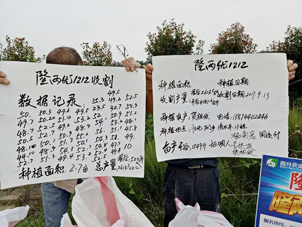 田的面積不大,但收割的產(chǎn)量卻并不少,2.7畝田,收獲了52袋谷子5227斤,折算每畝收獲1936斤濕谷,扣除20%的水分,干谷產(chǎn)量高達(dá)1549斤/畝田。當(dāng)問及種植戶賀祖發(fā)對(duì)隆王稻——隆兩優(yōu)1212這個(gè)品種是否滿意時(shí),他回答到:“種隆王稻,我不后悔”。