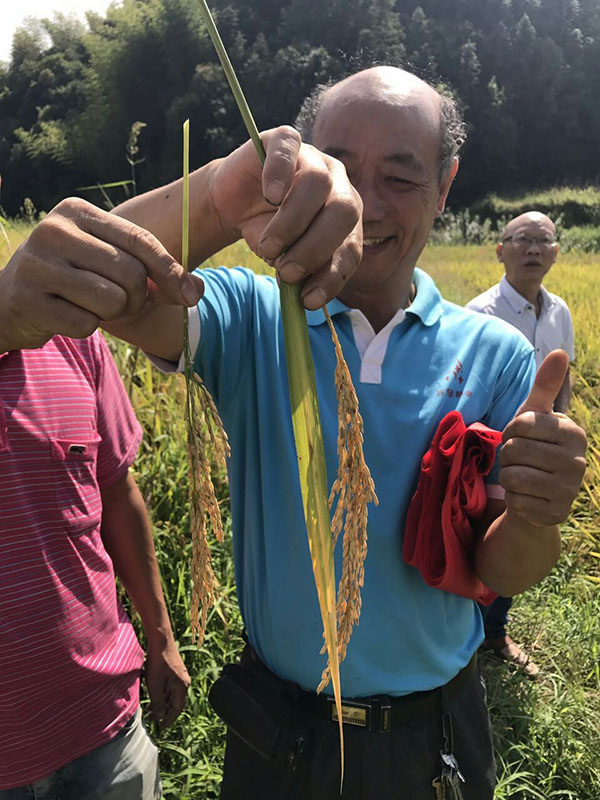 與會人員來到觀摩會現(xiàn)場沿著田埂、彎下身子看著將要收割的隆兩優(yōu)1988水稻,被眼前大大的稻穗、超高結(jié)實率的景象所深深地打動,比穗子的比穗子,數(shù)粒數(shù)的數(shù)粒數(shù),紛紛猜測著這塊田能收割多少斤,都想馬上知道財神稻到底能有多高的產(chǎn)量,興奮得像是自家的田地一般。示范戶陳有林說:“我這塊田肥水一般,靠近田埂里邊還會冒冷水,今年能種植長勢如此之好的水稻,靠的是“財神稻”這樣好品種,來年我50多畝耕地全部種上隆兩優(yōu)1988”,大家一致贊同,真是喜看稻田千重浪,欣然起舞在其間!